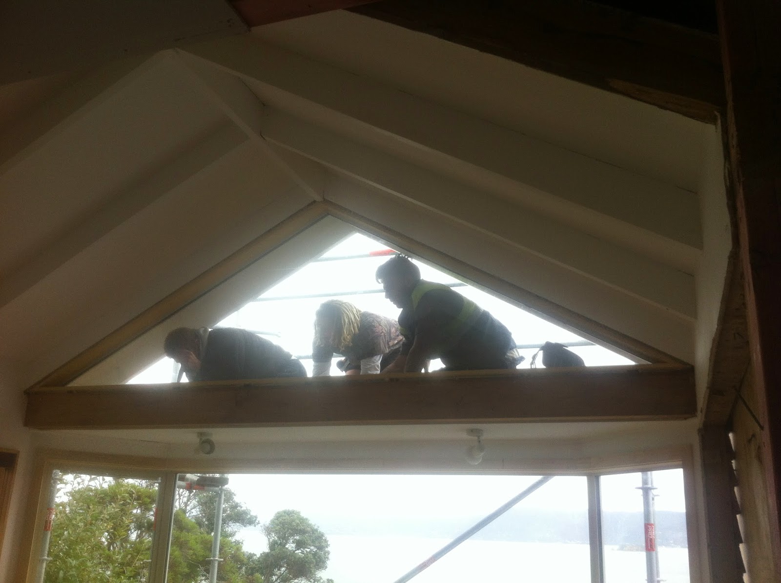 ちょっと雨のあがった朝、気がつくとアラン、マット、お猿さんのようにヒョイヒョイと屋根の上を軽々と歩く屋根屋さんたちが来ていました。